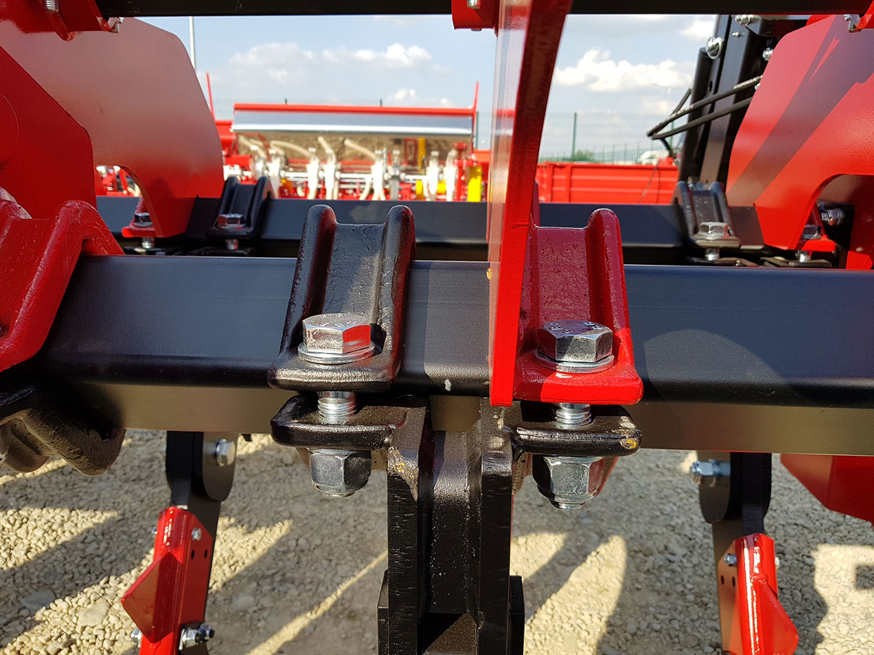 Fiecare ancora a scarificatorului/subsolierului este fixata pe sasiu individual cu bride fapt ce permite reglarea acestora pe cadru. Ca sistem de protectie ancorele scarificatorului/subsolierului sunt fixate de suportul reglabil prin intermediul a doua suruburi unul de mentinere si culisare sic el de al doilea de forfecare cu rol de protectie in vederea evitarii unor obstacole foarte mari care ar duce la deformarea sau ruperea utilajului. |